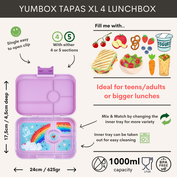 Zbaľte zdravé a rozmanité občerstvenie do svojho nového boxu na desiatu Yumbox XL TAPAS 4. Štyri oddelenia uľahčujú výber zdravých porcií. Možností je neúrekom. Pridajte orechy, krekry, ovocie, zeleninu, jogurt alebo dokonca dip. Vďaka silikónovému tesneniu medzi priehradkami sa z Yumboxu nevyleje jogurt, omáčka či ovocné pyré. Priehradky sú oddelené aj medzi sebou tak, aby sa maškrty v nich nemiešali.