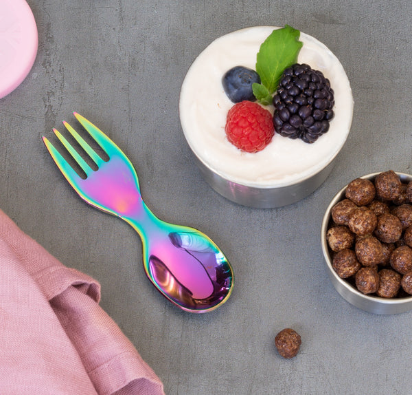 Jogurt, müsli alebo cestovinový šalát - jesť na cestách už nie je problém! S praktickou vidličko-lyžičkou od LEKKABOX v dúhovom dizajne! Vysokokvalitný príbor z nehrdzavejúcej ocele je malý a kompaktný, takže ho môžete ľahko vziať všade so sebou!